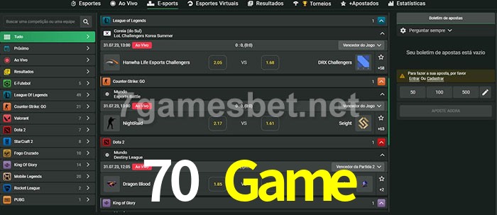O 70 Game oferece uma grande seleção de opções de apostas em e-sports com probabilidades competitivas